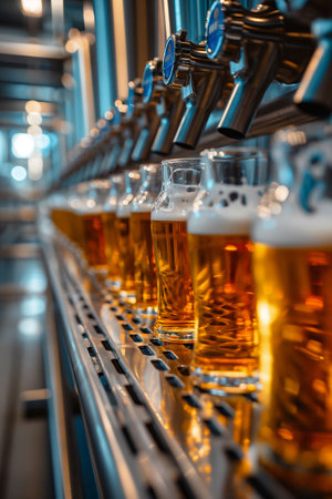 An industrial line of filled beer glasses, on a production conveyer belt, themes of manufacturing in a clean industry setting. High quality photo