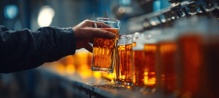 Close-up of hands gripping tall, cold beer glasses with amber tones glowing. Blurred brewery machinery in the background adds depth to the vibrant scene.