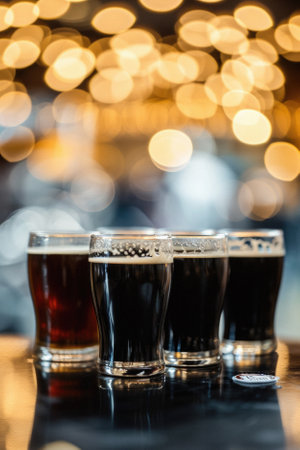 Closeup on mug of dark craft beer at the bar with blurry background, vertical
