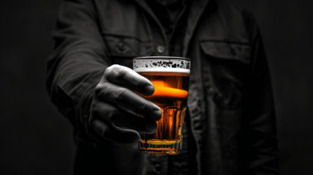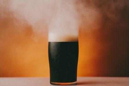 Dark beer glass with frothy head and steam on a warm orange background, perfect for cozy gatherings and celebrations