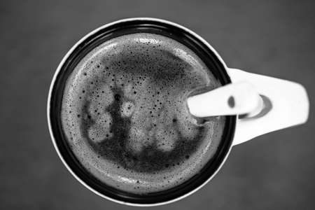 Hot tea cup on the black wooden table, flesh morning drinking, bird eye view shot
