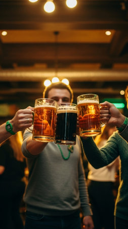 Overhead View Of Friends Toasting With Craft Beers, Celebrating Togetherness In a Warmly Lit Pub