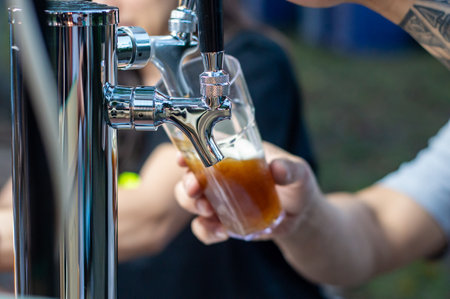 Man holding a glass of amber ale beer with a foamy head in a bar or pub. Refreshing beverage for a social gathering.