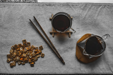 Traditional chinese tea ceremony accessories (cups, pouring tea) on the tea table, selective focus