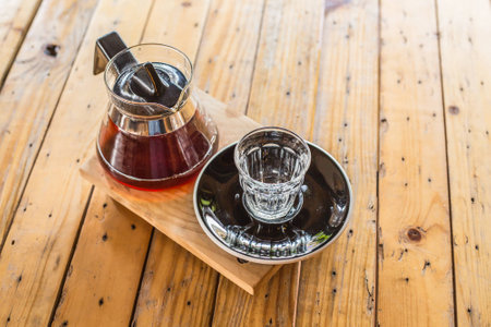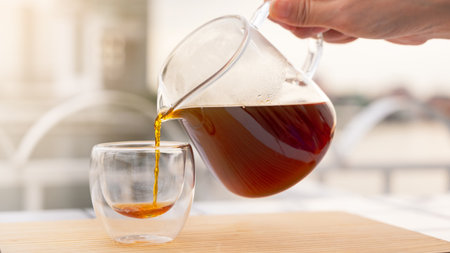 Black coffee is pouring into a cup from glass teapot