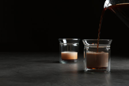 Pouring fresh coffee into glass on gray table. Space for text