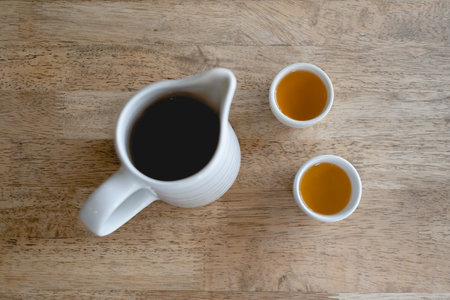 Caffeine-free beverage. Ceramic Cups of Herbal Coffee on Wooden Table. Coffee made from acorns, chicory, roasted barley. Three cups of dark, herbal coffee on rustic wooden table.