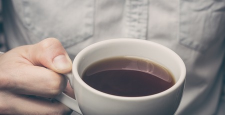 Take a break - man is holding cup of fresh coffee