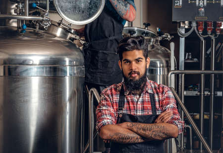 Portrait of tattooed, bearded Caucasian and Indian men in the craft beer microbrewery.