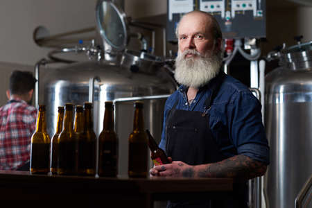 Professional brewer on his own craft alcohol production. Specialist, senior man in workwear testing beer on its taste, smell and color. Concept of open business, eco product, craft brewery, factory.