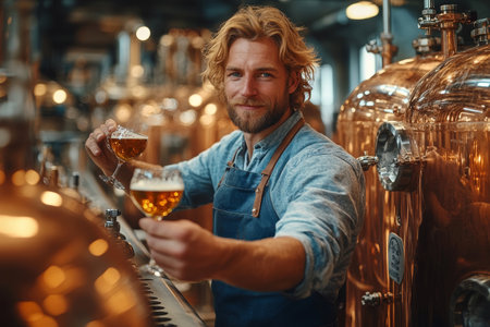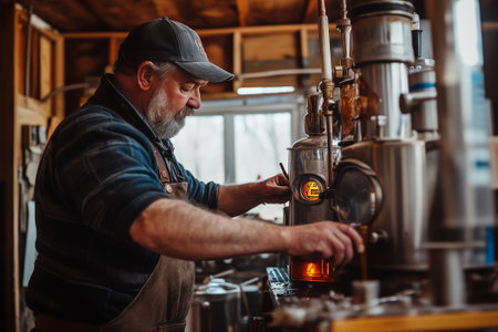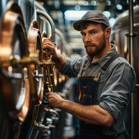 Expert brewer in a modern brewery, meticulously crafting beer with advanced brewing equipment and a focused expression
