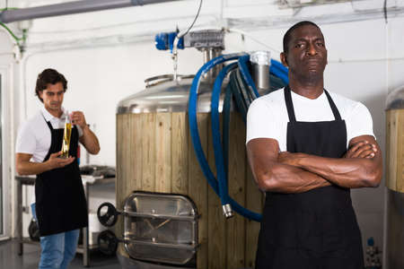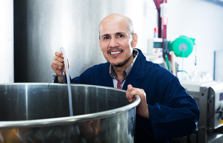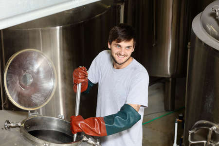Portrait of brewer who is making beer on his workplace in the brew-house..