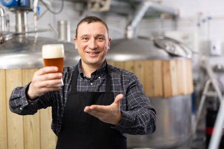 Portrait of brewer who is standing with glass of beer on his workplace in brew-house