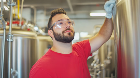 Industrial Worker in Red Shirt Inspecting Brewery Equipment with Safety Glasses.