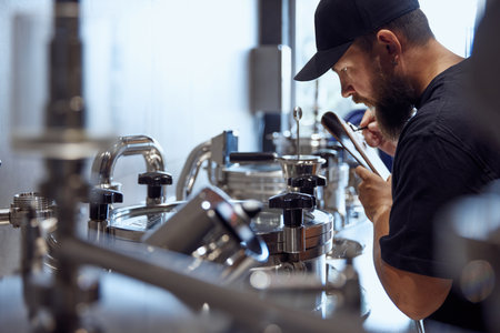 Bearded brewery technologist, focused man inspecting stainless steel brewing equipment, taking notes on clipboard. Craftsmanship of beer production.