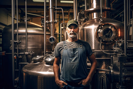 Man wearing an apron working in a brewery, standing next to brewing equipment. Professional and dedicated worker in a brewing environment.