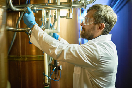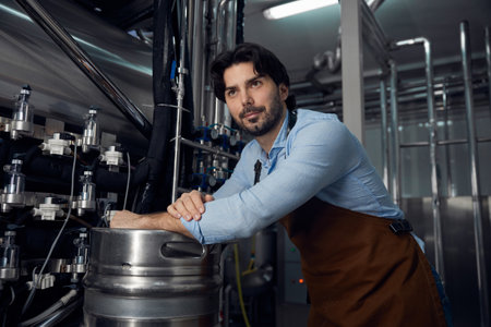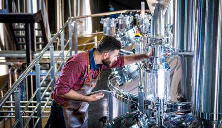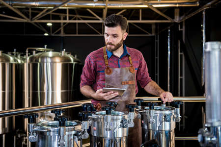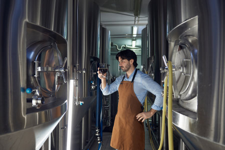 Young male brewer in leather apron supervising the process of beer fermentation at modern brewery factory