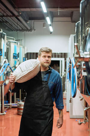 Young male brewer in workwear carrying white sack full of barley on shoulder while moving between two rows of huge steel tanks with beer