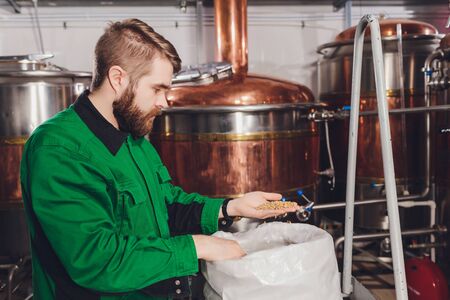 A young brewer in a leather apron controls the grinding of malt seeds in a mill at a modern brewery
