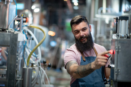 Man is working at craft beer factory. He is operating machinery in brewery. Small family business, production of craft beer.