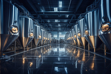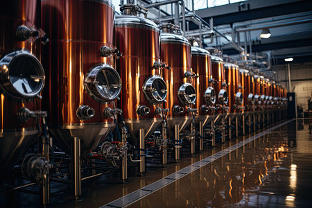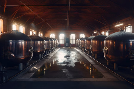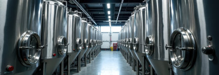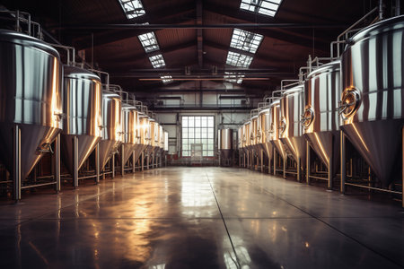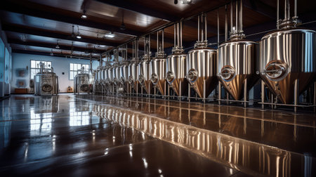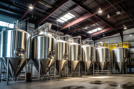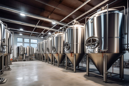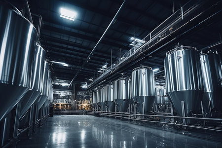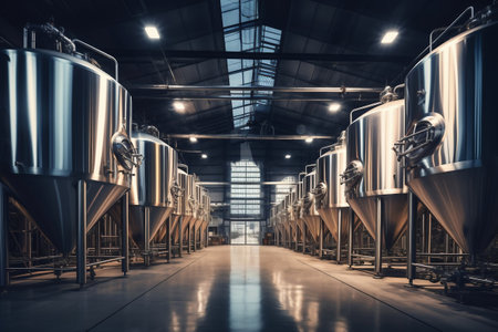 wide shot of brewery fermentation tanks in a row, created with generative ai