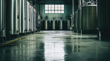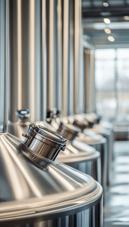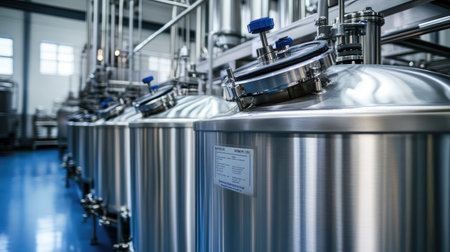 A row of industrial stainless steel tanks in a modern facility, illustrating storage and manufacturing processes for various liquids. Ideal for technology themes.