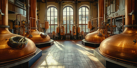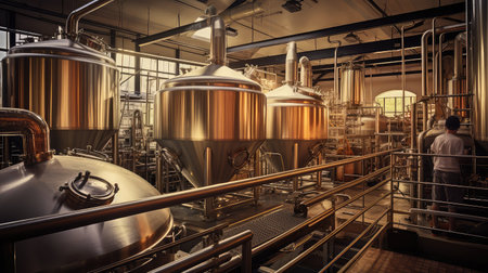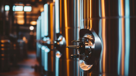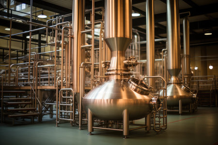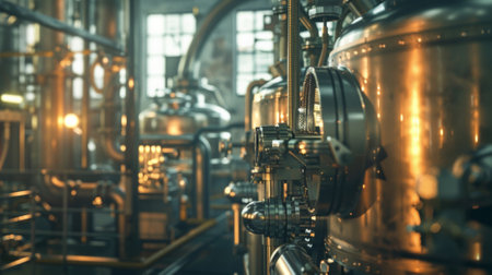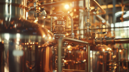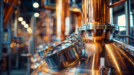 polished copper tanks used for aging and storing beer, brewerys industrial setting, warm, golden lighting, emphasizing the precision and craftsmanship of modern brewing techniques. High quality photo