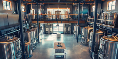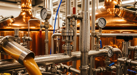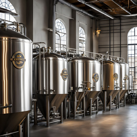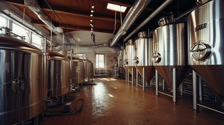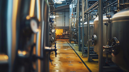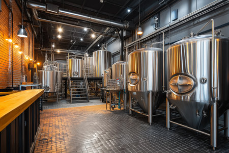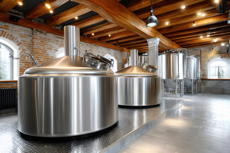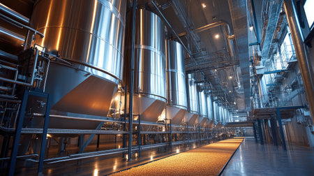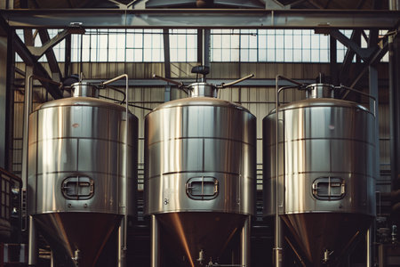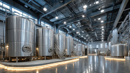 Contemporary stainless steel brewing equipment showcased in a pristine factory setting