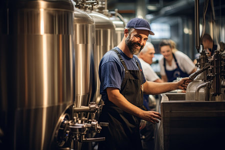 Amidst the lively ambiance of a brewery, employees passionately craft beer. Generated with AI