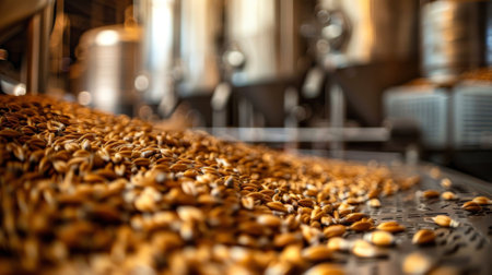 Slightly blurred grain silos and mill machinery create a serene backdrop for the slow toasting of malt adding a touch of rustic charm.