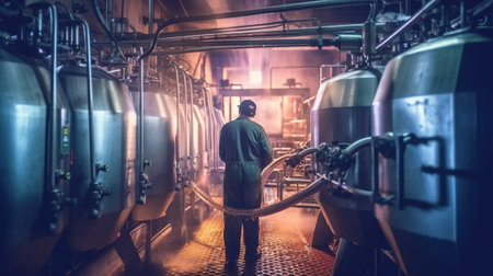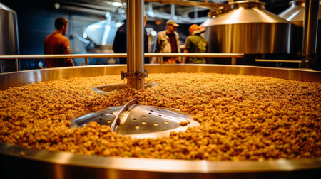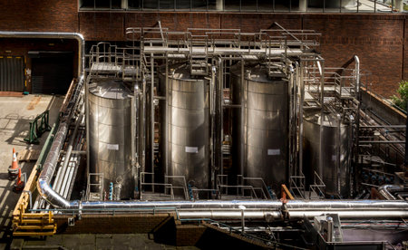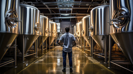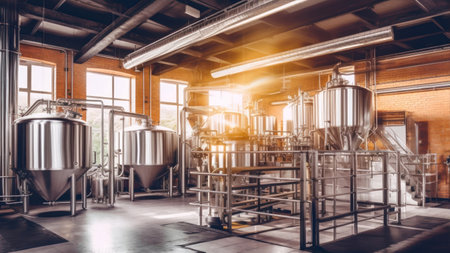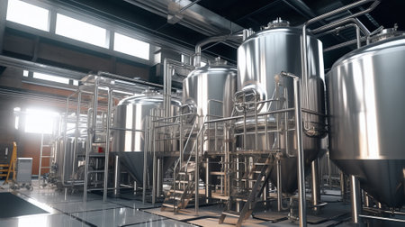 Generative AI Mash vats of a brewery. Large metal fermentation tanks