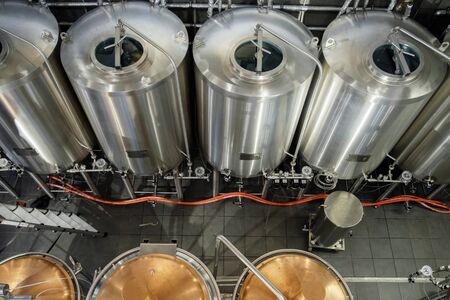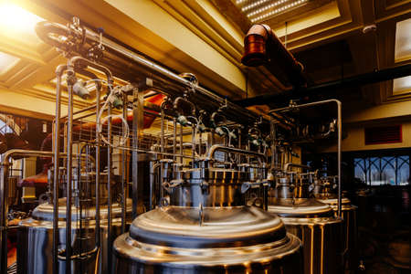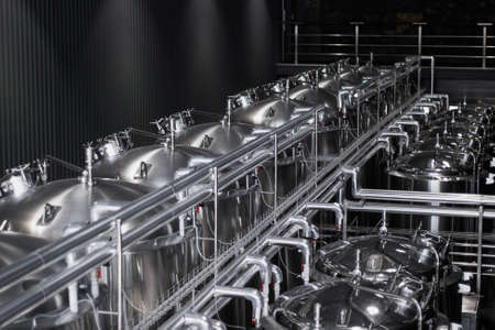 Stainless steel brewing tanks and equipment, iron reservoirs and pipes in modern beer factory. Brewery