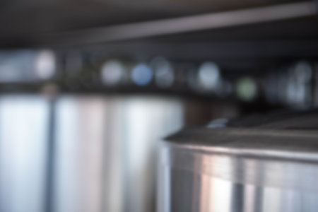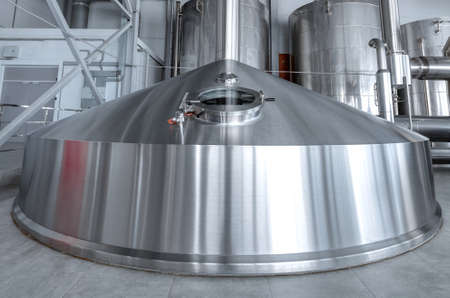 Fermentation mash vats or boiler tanks in a brewery factory. Brewery plant interior. Factory for the production of beer. Modern production of draft drinks. selective focus