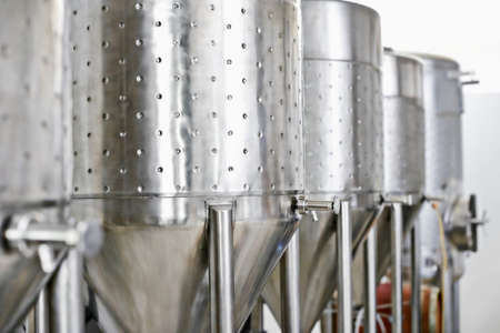 Stainless steel tanks for beer fermentation in a modern brewery.