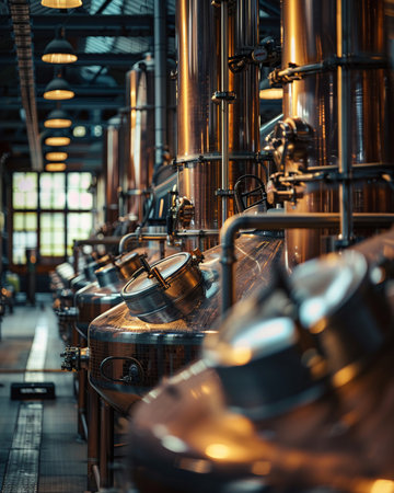 Beneath a canopy of sleek stainless steel, amber liquid is carefully brewed in modern tanks, illuminated by cinematic lighting that highlights the craftsmanship.