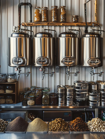 Homebrewing equipment layout, shiny stainless steel fermenters, brewing kettle, hops and malt ingredients, brewing tools neatly arranged