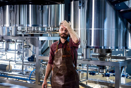 Young male brewer in leather apron supervising the process of beer fermentation at modern brewery factory