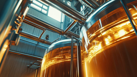 Inside a contemporary craft brewery, large stainless steel tanks filled with orange liquid reflect cinematic lighting, revealing a network of pipes and ladders.