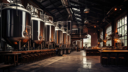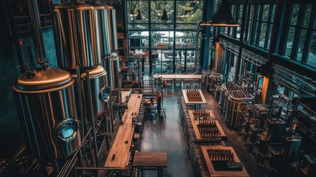 Experience a vibrant brewery interior featuring large stainless steel tanks and wooden tables, perfect for enjoying craft beer with friends in a stylish setting.