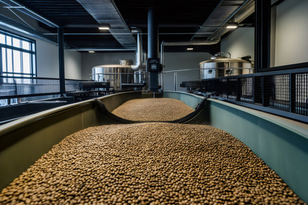 Raw coffee beans waiting to be roasted in a modern coffee factory, industrial production process