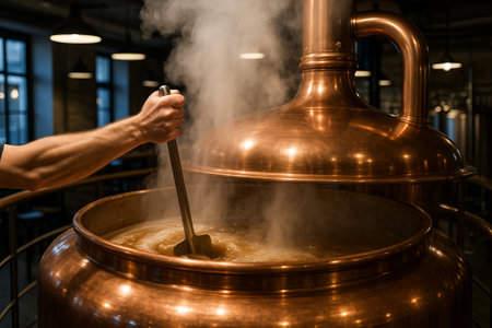 Copper vat brewing process showing stirring of boiling liquid in brewery with steam rising and industrial setting. concept of traditional brewing, craftsmanship, beer production.