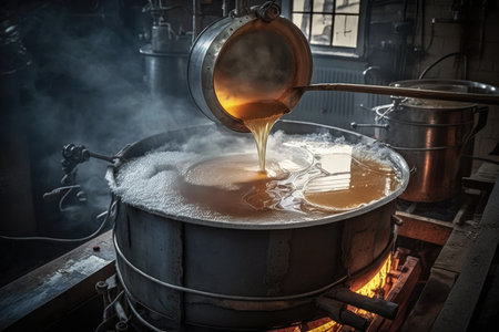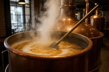 Copper vat brewing process with steam and stirring paddle in traditional brewery setting. concept of craft beermaking, artisanal brewing techniques, steam brew.