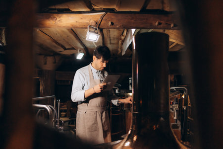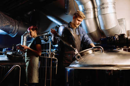 Young male brewer in leather apron supervising the process of beer fermentation at modern brewery factory