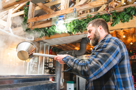 A man carefully stirring a pot in a brewery, showing his brewing process and concentration