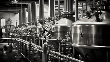 Craft beer brewing equipment in brewery Metal tanks, alcoholic drink production.