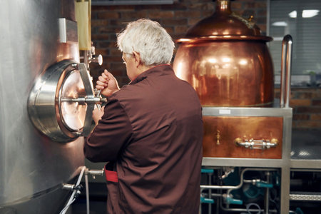 A focused man with gray hair carefully examines brewing equipment in a modern brewery. His meticulous attention to detail highlights the artistry and precision involved in crafting quality beverages.