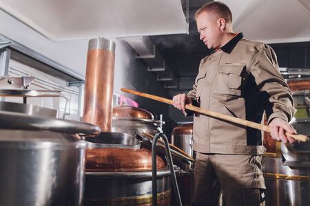 Wooden stirrer in the process of brewing beer. Background with selective focus and copy space for text