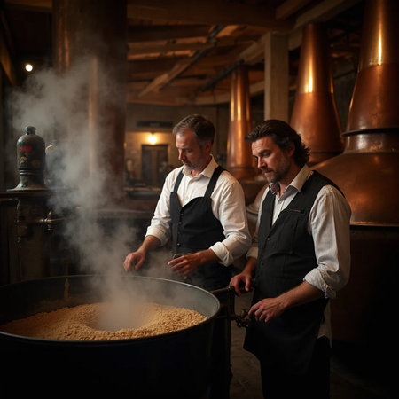Antique copper distillery equipment aligned inside an old factory with ambient lighting