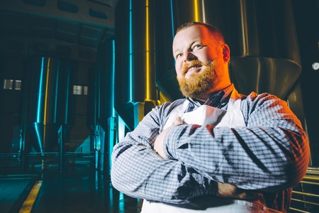 Professional brewer on his own craft alcohol production. Specialist, man wearing in workwear posing confident with hands crossed. Concept of open business, eco product, craft brewery, individual factory.