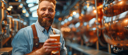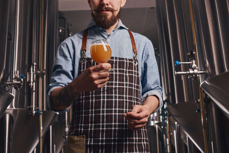 Sophisticated craft beer maker in an apron holds a drink and oversees its quality